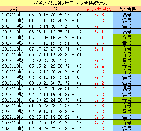 蓝球分析:在第119期历史同期开奖中,蓝球号码奇偶比为11:10,最近5年同期奇偶走势为:奇、奇、偶、奇、偶,今年同期预计再出偶数蓝球,推荐蓝球16。